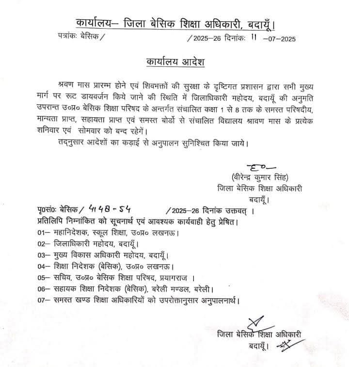 श्रवण मास प्रारम्भ होने एवं शिवभक्तों की सुरक्षा के दृष्टिगत प्रशासन द्वारा सभी मुख्य मार्ग पर रूट डायवर्जन किये जाने की स्थिति में जिलाधिकारी महोदय, बदायूँ की अनुमति उपरान्त उ०प्र० बेसिक शिक्षा परिषद के अन्तर्गत संचालित कक्षा 1 से 8 तक के समस्त परिषदीय, मान्यता प्राप्त, सहायता प्राप्त एवं समस्त बोर्डो से संचालित विद्यालय श्रावण मास के प्रत्येक शनिवार एवं सोमवार को बन्द रहेगें।