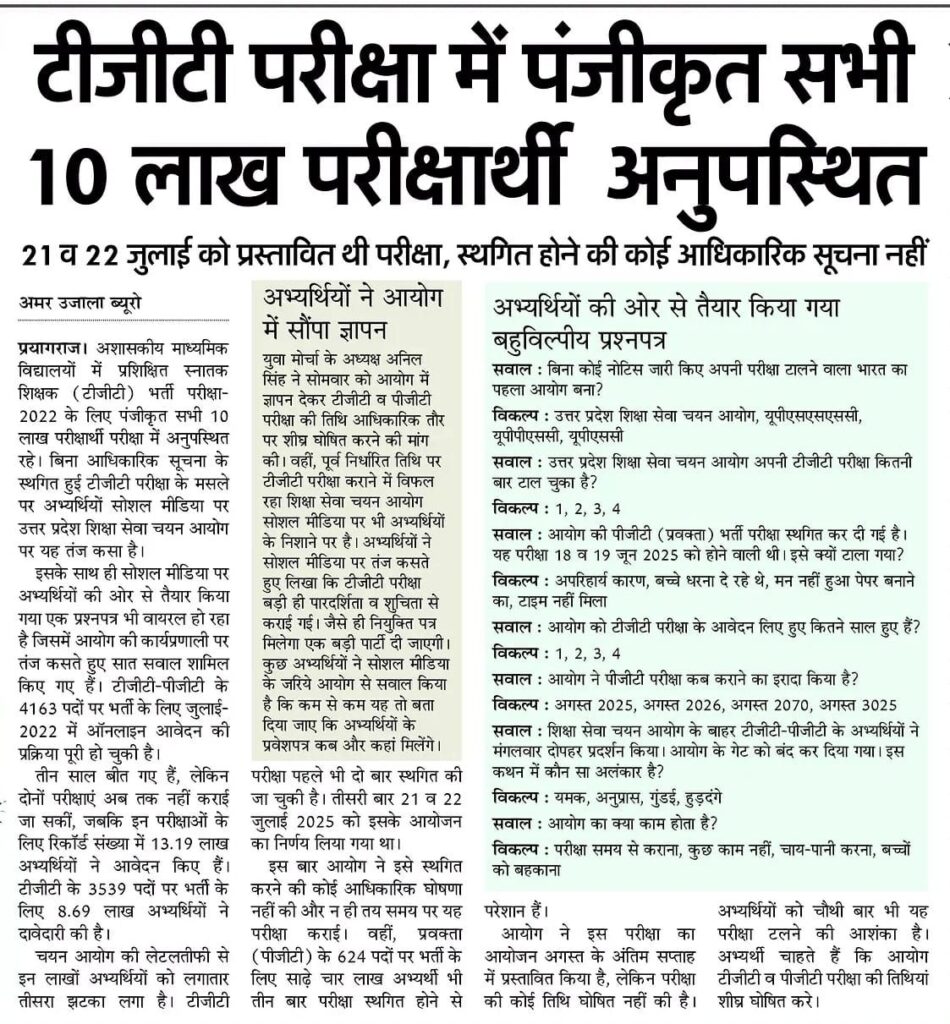 टीजीटी परीक्षा में पंजीकृत सभी 10 लाख परीक्षार्थी अनुपस्थित