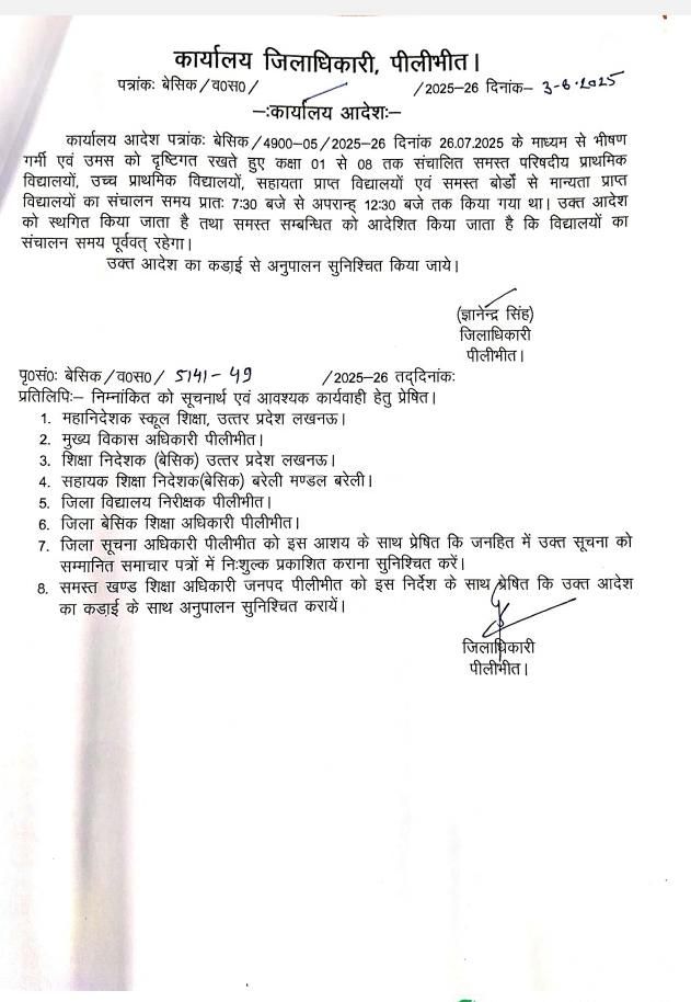 भीषण गर्मी एवं उमस को दृष्टिगत रखते हुए कक्षा एक से आठ तक संचालित समस्त परिषदीय विद्यालयों, उच्च प्राथमिक विद्यालय, सहायता प्राप्त विद्यालयों एवं समस्त बोर्ड से मान्यता प्राप्त विद्यालयों का संचालन प्रातः 7:30 बजे से 12:30 बजे तक किया गया था। उक्त आदेश को स्थगित किया जाता है तथा समस्त संबंधित को आदेश किया जाता है कि विद्यालयों का संचालन समय पूर्ववत रहेगा। उक्त आदेश का अनुपालन सुनिश्चित किया जाए ।