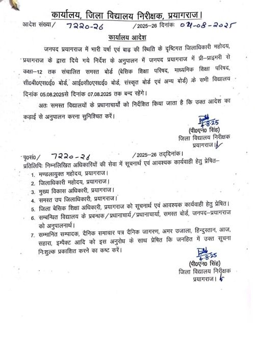 मौसम विज्ञान केन्द्र लखनऊ द्वारा दिनांक 04.08.2025 से भारी वर्षा की सम्भावना व्यक्त करने तथा दिनांक 03.08.2025 से भारी वर्षा व शहरी क्षेत्रों तथा विभिन्न गांवों में अत्यधिक जल जमाव के दृष्टिगत जिलाधिकारी महोदय, प्रयागराज के निर्देश के क्रम में दिनांक 05.08.2025 से दिनांक 07.08.2025 तक सभी परिषदीय, राजकीय, मान्यता प्राप्त, सहायता प्राप्त आई०सी०एस०ई०, सी०बी०एस०ई० बोर्ड के हिन्दी/अंग्रेजी माध्यम के कक्षा 01 से 08 तक के समस्त विद्यालय बन्द रहेंगे। परिषदीय *शिक्षक वर्क फ्राम होम के अन्तर्गत डी०बी०टी०, यू०-डायस प्लस एवं अन्य विभागीय कार्यों का सम्पादन करना सुनिश्चित करेंगे*। साथ ही जिन विद्यालयों में जिला प्रशासन द्वारा बाढ़ चौकी व रैन बसेरा बनाया गया है उक्त विद्यालय के प्रधानाध्यापक व संबंधित खण्ड शिक्षा अधिकारी इस हेतु अपना पूर्ण सहयोग प्रदान करेंगे।