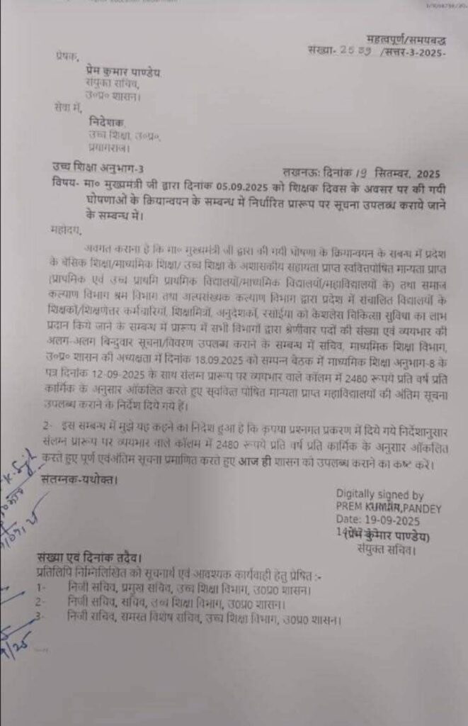 शिक्षक दिवस के अवसर माननीय मुख्यमंत्री जी की घोषणा के अनुरूप कैशलेश चिकित्सा सुविधा हेतु प्रति शिक्षक/कर्मचारी का प्रति वर्ष 2480 रूपये (206.66 प्रतिमाह) के आगणन के अनुसार सूचना उपलब्ध कराने का आदेश।