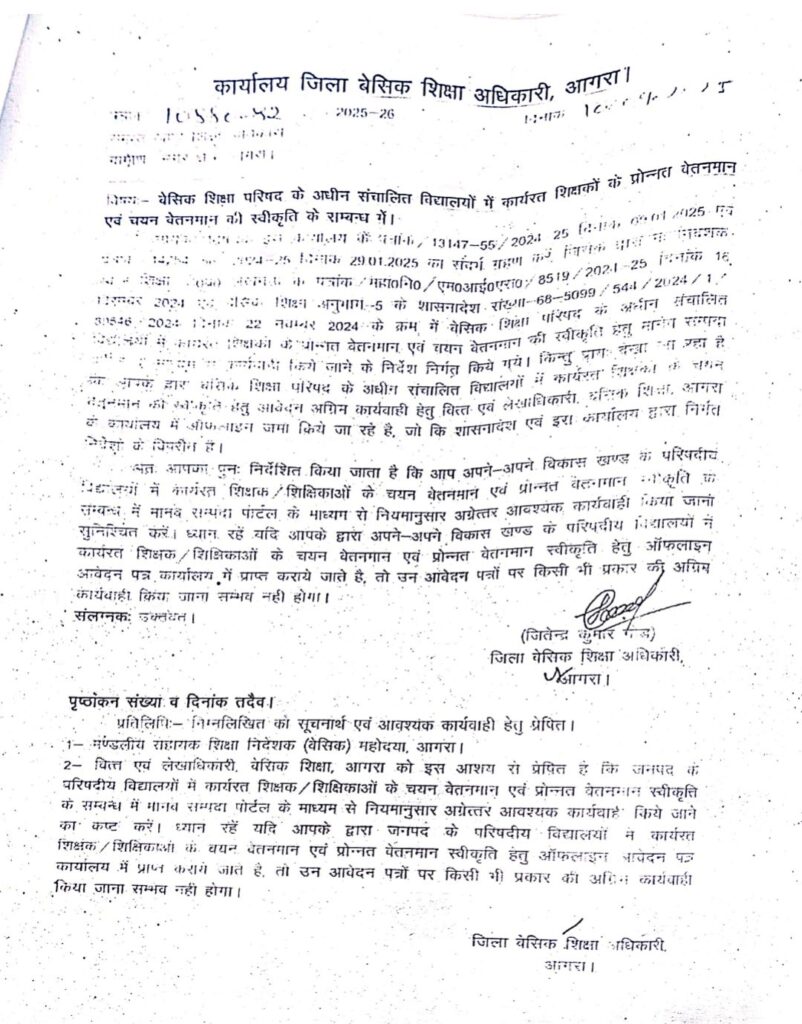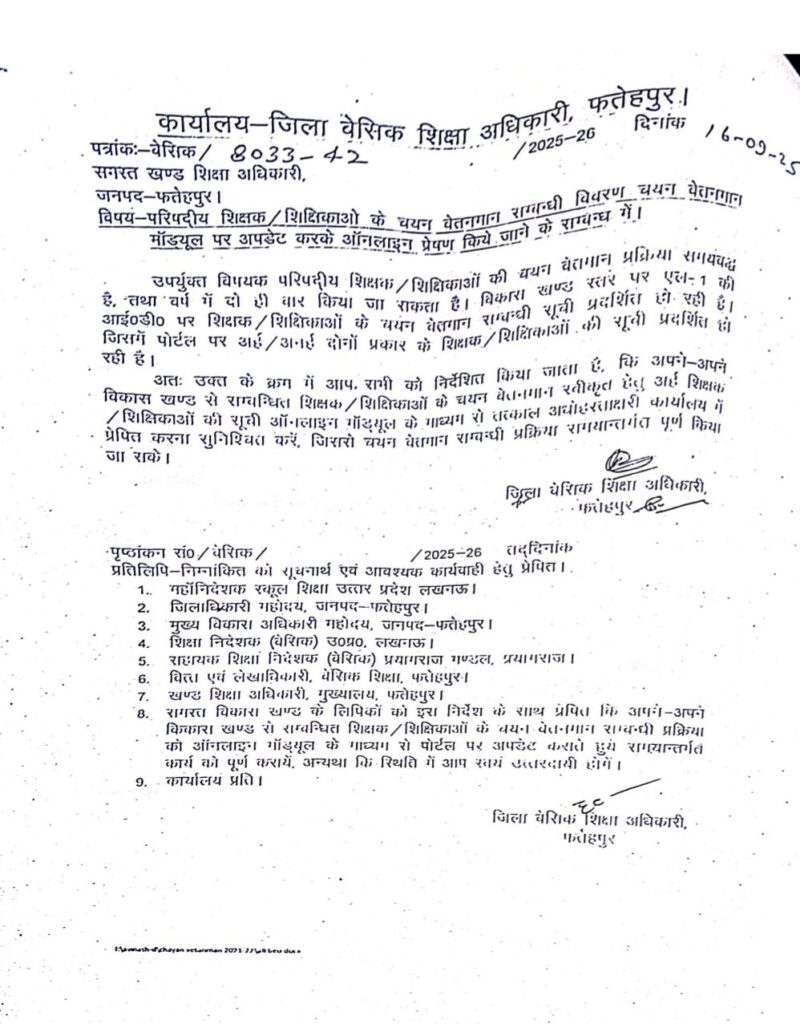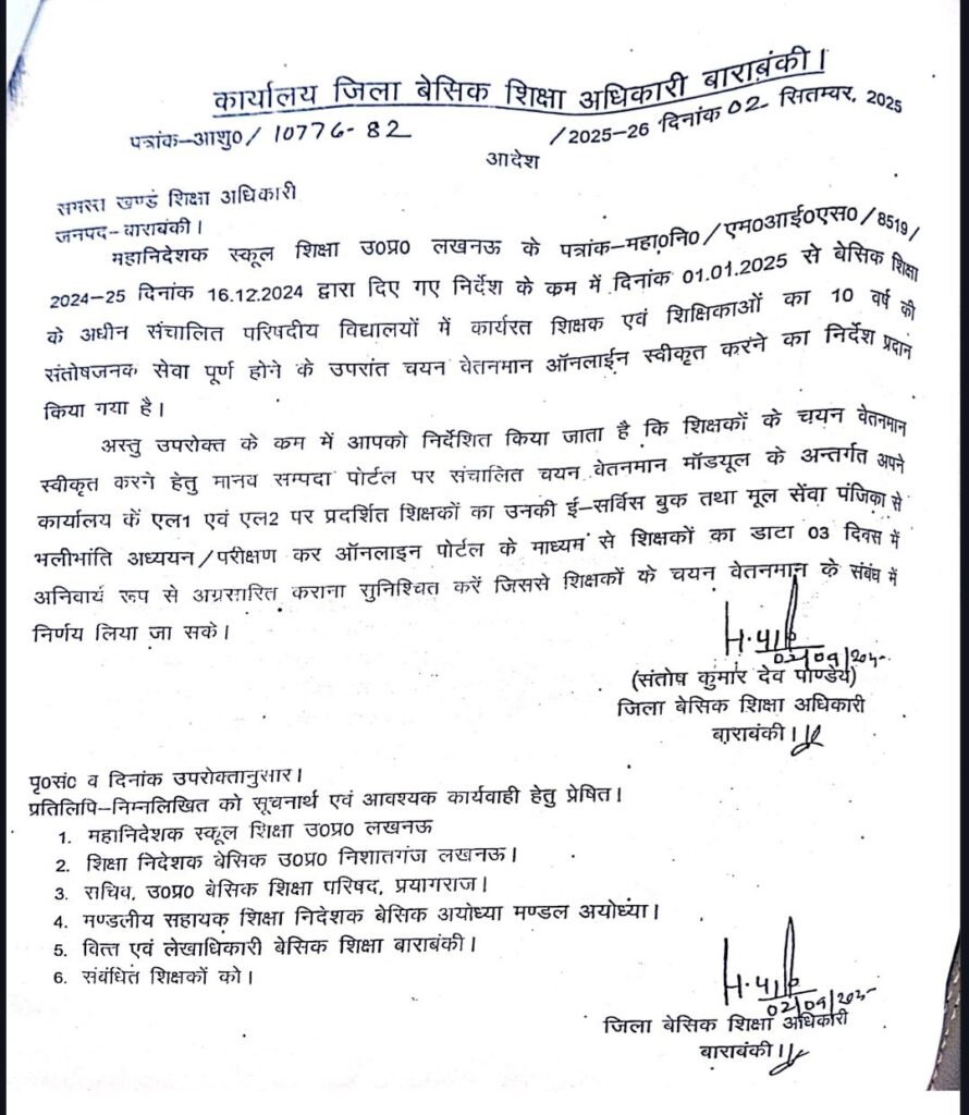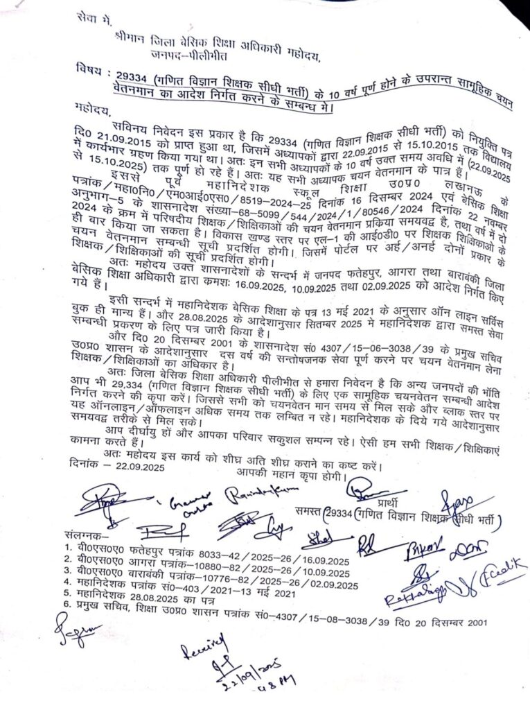 विभाग में 21 सितंबर 2025 को 10 वर्ष पूर्ण होने पर 29334 विज्ञान गणित के अध्यापकों ने चयन वेतनमान के लिए प्रभारी बीएसए को आवेदन पत्र दिया