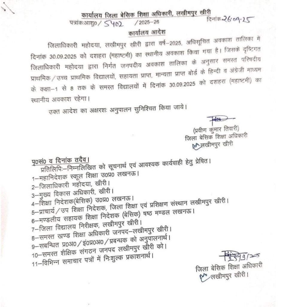 Primary ka Masterअवकाश सूचनाजनपद के कक्षा 1 से 8 तक से समस्त विद्यालयों में दिनांक 30 सितंबर को दशहरा का स्थानीय अवकाश By Basic waleOn: September 29, 2025 10:43 AMFollow Us:जनपद के कक्षा 1 से 8 तक से समस्त विद्यालयों में दिनांक 30 सितंबर को दशहरा का स्थानीय अवकाश