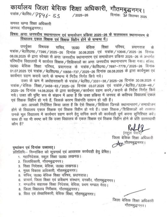 अन्तः जनपदीय स्थानान्तरण एवं समायोजन प्रक्रिया 2025-26 के फलस्वरूप स्थानान्तरण से विद्यालय एकल शिक्षक एवं शिक्षक विहीन होने के सम्बन्ध में