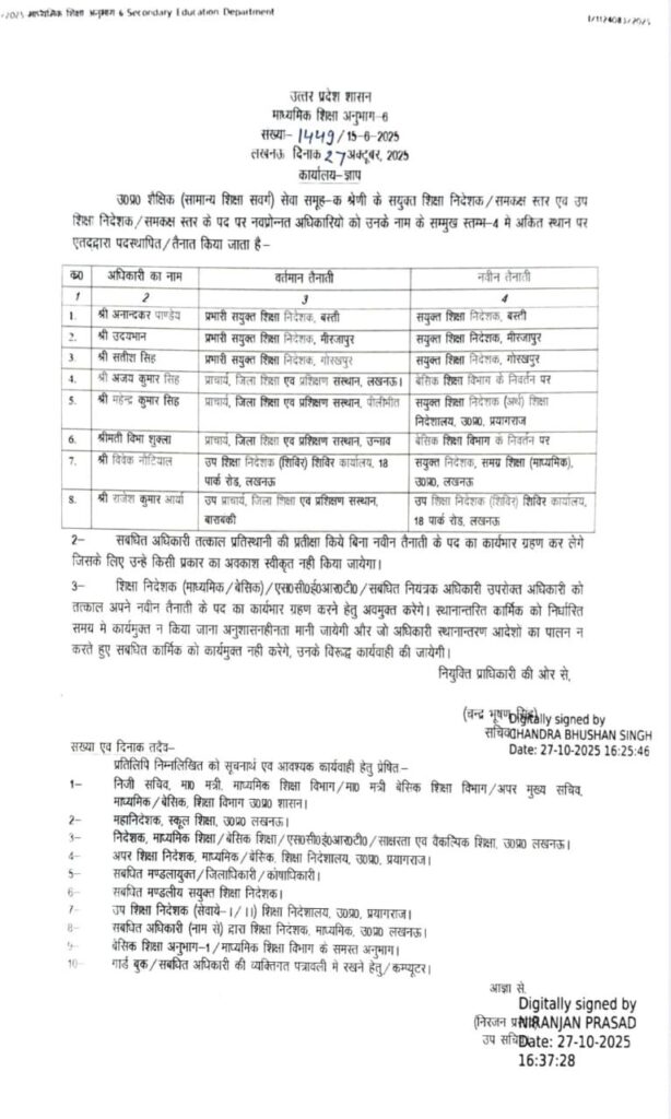 उ०प्र० शैक्षिक सेवा समूह क श्रेणी के सयुक्त शिक्षा निदेशक / समकक्ष स्तर एवं उप शिक्षा निदेशक / समकक्ष स्तर के पद पर नवप्रोन्नत अधिकारियो को उनके नाम के सम्मुख स्तम्भ-4 में अकित स्थान पर एतद्वारा पदस्थापित / तैनात किया जाता