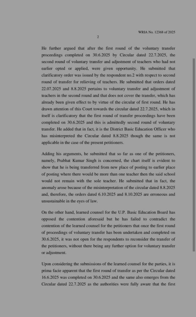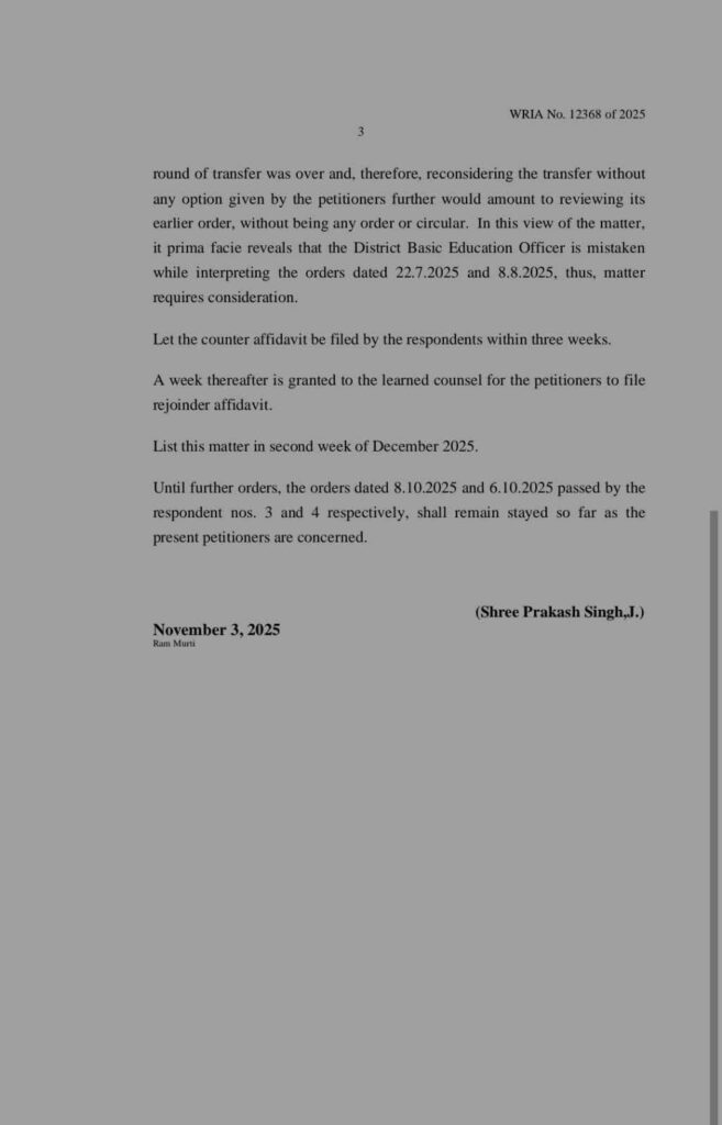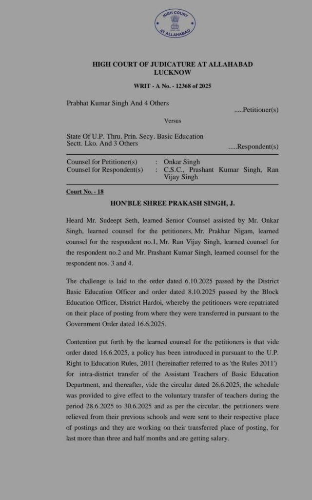 माननीय उच्च न्यायालय की लखनऊ खण्डपीठ ने समायोजित शिक्षकों को बड़ी राहत देते हुये अद्यतन हो रहे अनाधिकृत स्थानांतरणों (वापसी मैटर) पर स्टे कर दिया है।