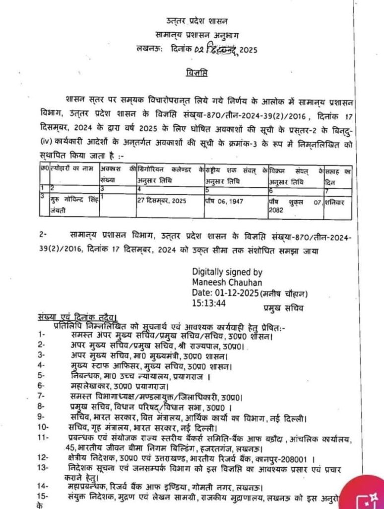 Primary ka Masterअवकाश सूचनाशिक्षा विभाग27 दिसंबर 2025 को गुरु गोविंद सिंह जयंती के उपलक्ष्य में अवकाश हेतु शासनादेश जारी! By Basic waleOn: December 2, 2025 6:44 PMFollow Us:27 दिसंबर 2025 को गुरु गोविंद सिंह जयंती के उपलक्ष्य में अवकाश हेतु शासनादेश जारी!
