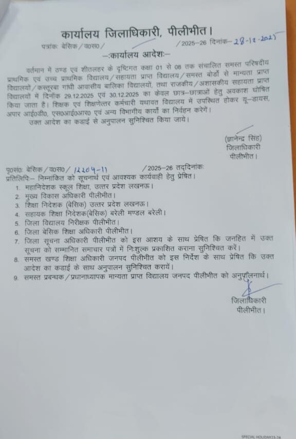 Primary ka Masterअवकाश सूचनाजनपद में शीत लहर के कारण 29 व 30 का अवकाश घोषित By Basic waleOn: December 28, 2025 6:46 PMFollow Us:जनपद में शीत लहर के कारण 29 व 30 का अवकाश घोषित Visit basicwale.inJoin our Whatsapp channel