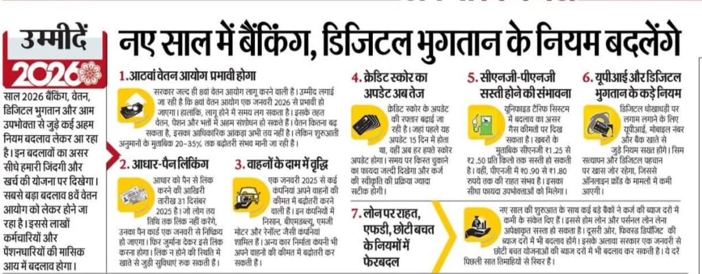 साल 2026 बैंकिंग, वेतन, डिजिटल भुगतान और आम उपभोक्ता से जुड़े कई अहम नियम बदलाव लेकर आ रहा है। इन बदलावों का असर सीधे हमारी जिंदगी और खर्च की योजना पर दिखेगा। सबसे बड़ा बदलाव 8वें वेतन आयोग को लेकर होने जा रहा है। इससे लाखों कर्मचारियों और पेंशनधारियों की मासिक आय में बदलाव होगा।