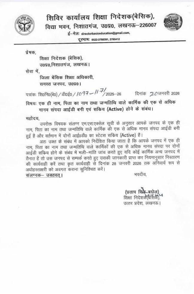Primary ka Masterएक ही नाम, पिता का नाम और जन्मतिथि पर कई मानव संपदा आईडी बनने पर जांच व कार्रवाई के आदेश By Basic waleOn: February 11, 2026 2:07 PMFollow Us:एक ही नाम, पिता का नाम और जन्मतिथि पर कई मानव संपदा आईडी बनने पर जांच व कार्रवाई के आदेश
