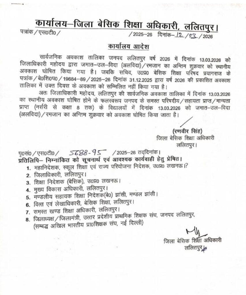 अलविदा/रमजान के उपलक्ष्य में जनपद में 13 मार्च का अवकाश हुआ घोषित, देखें आदेश